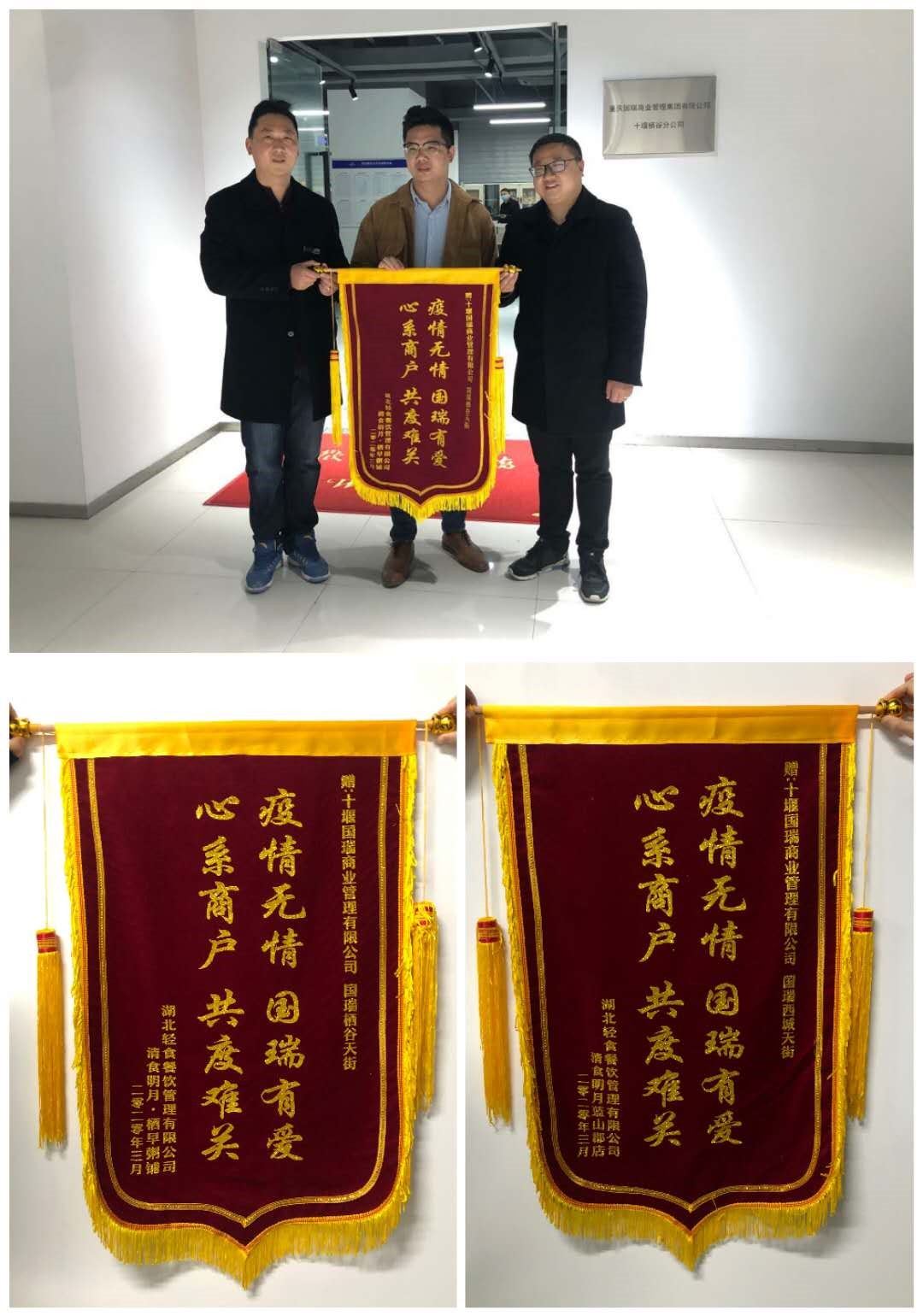4月3日,棲谷天街、西城天街商戶“清時明月”店主專程將一面印有“疫情無情 國瑞有愛 心系商戶 共渡難關(guān)”的大紅錦旗送到了國瑞商旅集團(tuán)十堰公司辦公室,對疫情期間商管公司提供的熱情、高效、優(yōu)質(zhì)的服務(wù)表示衷心感謝。