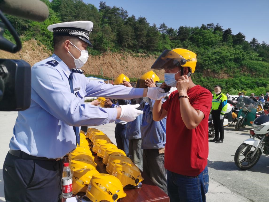 交管局領(lǐng)導(dǎo)指導(dǎo)務(wù)工人員正確佩戴頭盔