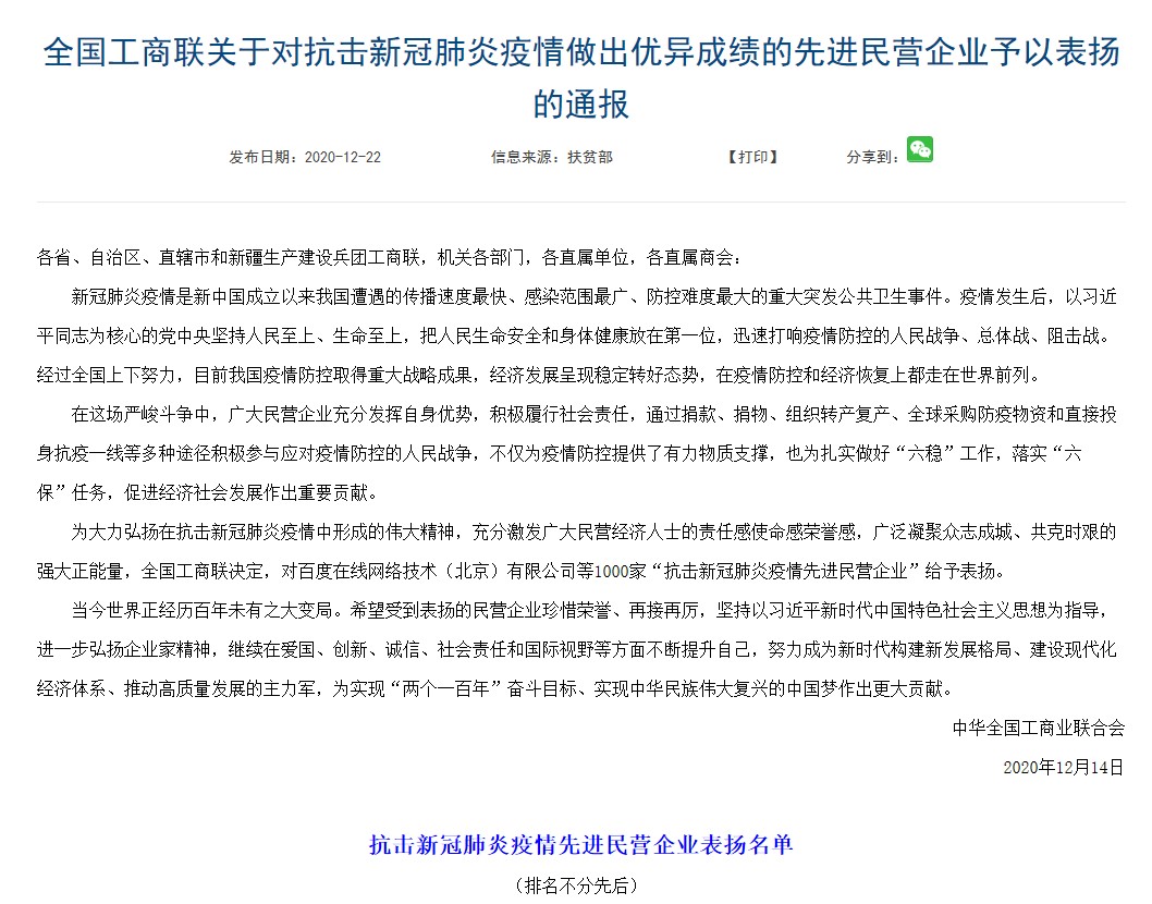 12月21日,全國工商聯(lián)十二屆四次執(zhí)委會議在廣西壯族自治區(qū)南寧市召開。會上,全國工商聯(lián)對1000家“抗擊新冠肺炎疫情先進民營企業(yè)”進行了表彰,重慶國瑞控股集團因在疫情防控、復(fù)工復(fù)產(chǎn)、積極捐贈等方面的成績突出,榮獲“全國抗擊新冠肺炎疫情先進民營企業(yè)”的榮譽稱號。