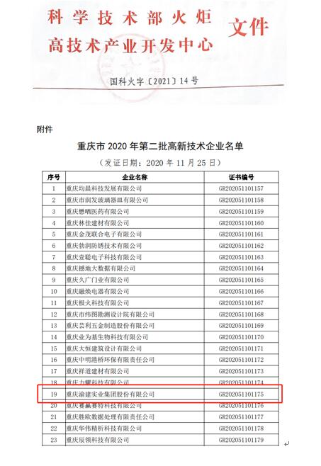 重慶渝建實(shí)業(yè)集團(tuán)股份有限公司 通過“高新技術(shù)企業(yè)”認(rèn)定