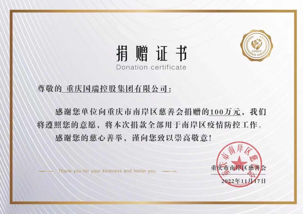 11月16日,重慶國瑞控股集團(tuán)捐贈(zèng)200萬元助力疫情防控,用實(shí)際行動(dòng)履行企業(yè)的社會(huì)責(zé)任,為打贏疫情防控殲滅戰(zhàn)貢獻(xiàn)力量,其中捐贈(zèng)重慶市南岸區(qū)和墊江縣各100萬元。